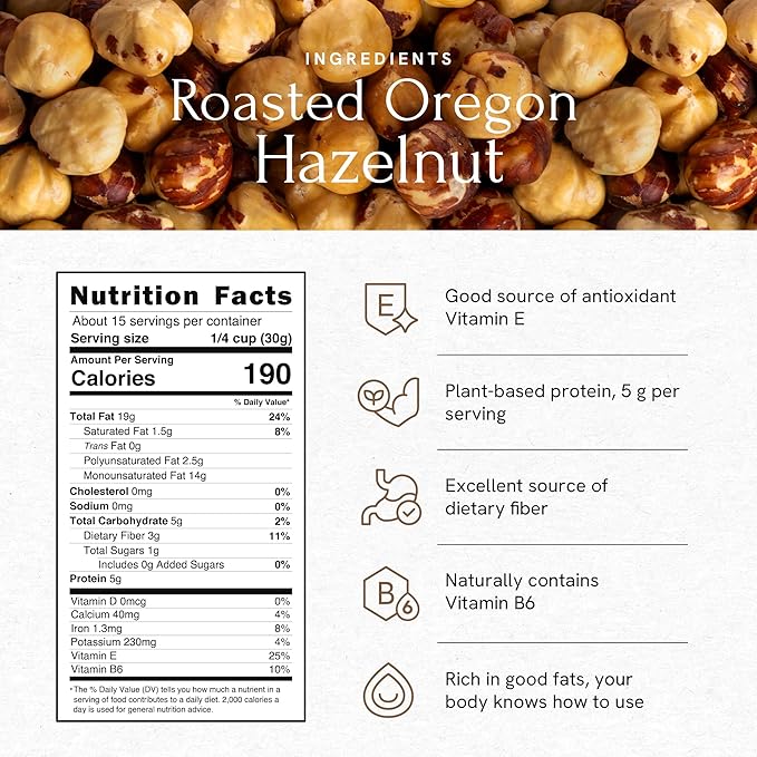 - Premium Roasted Hazelnuts – 100% Oregon-grown filberts, dry-roasted to bring out a naturally sweet, buttery flavor without added salt or oil.