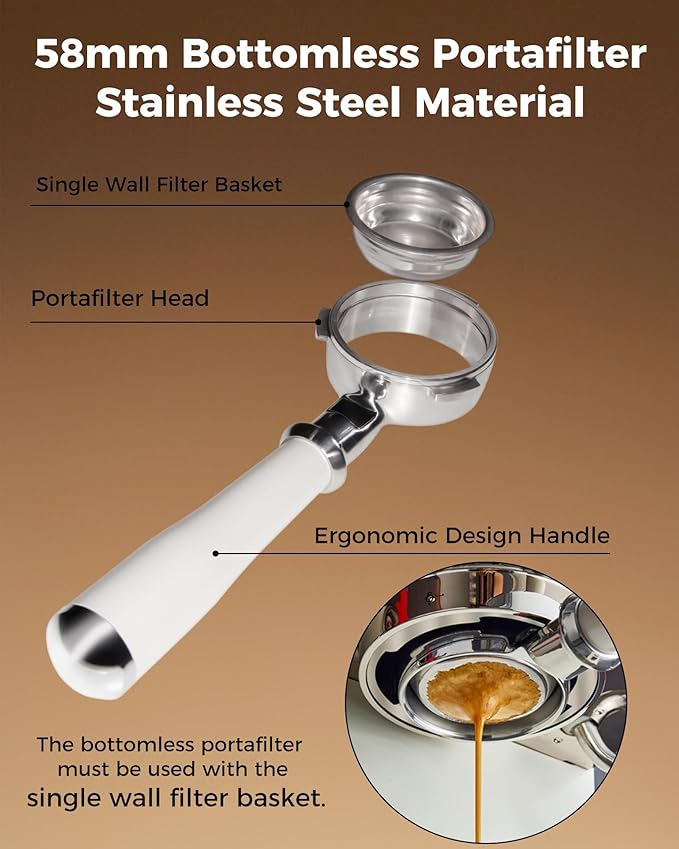 - [58mm Commercial Grade Brew System] - The 58mm commercial-grade stainless steel filter, compared to the standard 51mm filter, creates a thinner coffee layer and achieves higher extraction efficiency with the same amount of grounds. With its plastic-free 58mm brewing head and low-pressure pre-soaking function, it delivers a more thorough extraction, resulting in an espresso with a refined taste and rich crema.