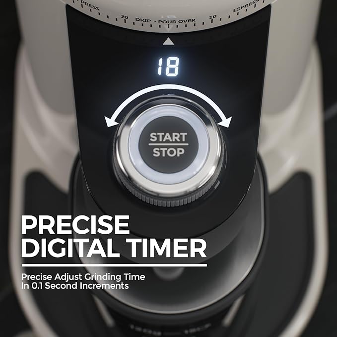 - One-touch Start/Stop: Our espresso machine grinder has an easy one-touch on button with a precision digital timer. You can choose the number of cups and grinding time according to your needs, with 5s to 40s time.