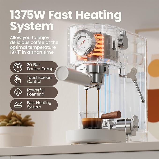 - Home Barista: With our espresso machines, you can effortlessly create premium espresso, cappuccino and latte coffees. It has a powerful 20 bar professional pressure system and a 1376 watt heating system to provide optimal pressure and temperature (197°F), as well as a visual pressure gauge to help you adjust the flavor of your coffee at any time.
